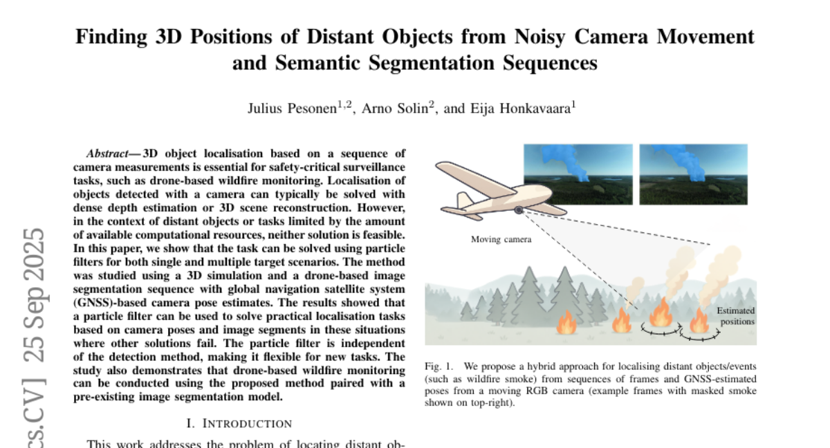 想象一下,当森林深处冒起野火的烟雾时,救援队伍需要在最短时间内找到火源的确切位置才能有效扑救。传统的方法要么需要救援人员冒险深入火场,要么依赖昂贵的设备才能获得准确的位置信息。但是,来自芬兰国家测绘局和阿尔托大学的研究团队在2025年9月发表的这项研究,为我们带来了一个令人惊喜的解决方案。这项发表在计算机视觉领域arXiv预印本平台的研究(论文编号:arXiv:2509.20906v1),由Julius Pesonen、Arno Solin和Eija Honkavaara三位研究者共同完成,展示了如何让普通无人机仅凭摄像头和GPS定位,就能在十公里外准确找到野火的具体位置。
